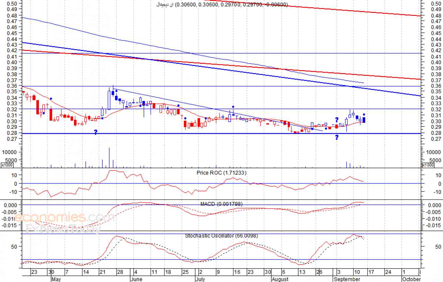 ومن المتوقع ان يكون النطاق السعري خلال جلسة اليوم بين مستوى الدعم هو 0.29 درهم وبين مستوى المقاومة هو 0.30 درهم