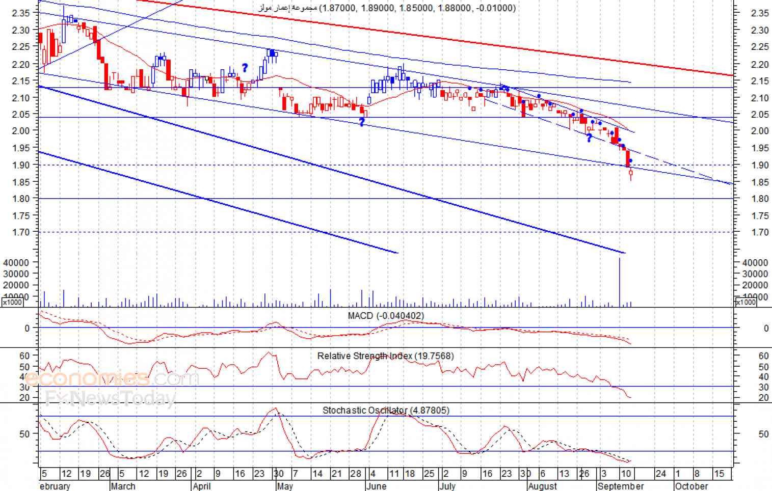 انخفض السهم كما توقعنا في تقريرنا الأخير لينهي تداولات أمس الاحد عند مستوى 1.88 درهم، وهو ادنى مستوى يصل اليه السهم منذ بداية تداوله، مخترقا بذلك هدفه السعري المتوقع عند 1.90 درهم، والذي يعد مستوى الدعم السابق، كما تراجع السهم مخترقا القناة الهابطة طويلة الأجل، وهو ما ولد هدفا سعريا عند مستوى 1.70 درهم، ويتجه السهم حاليا لمستوى الدعم التالي عند 1.80 درهم. شرط ثبات السهم أسفل مستوى 1.93 درهم.