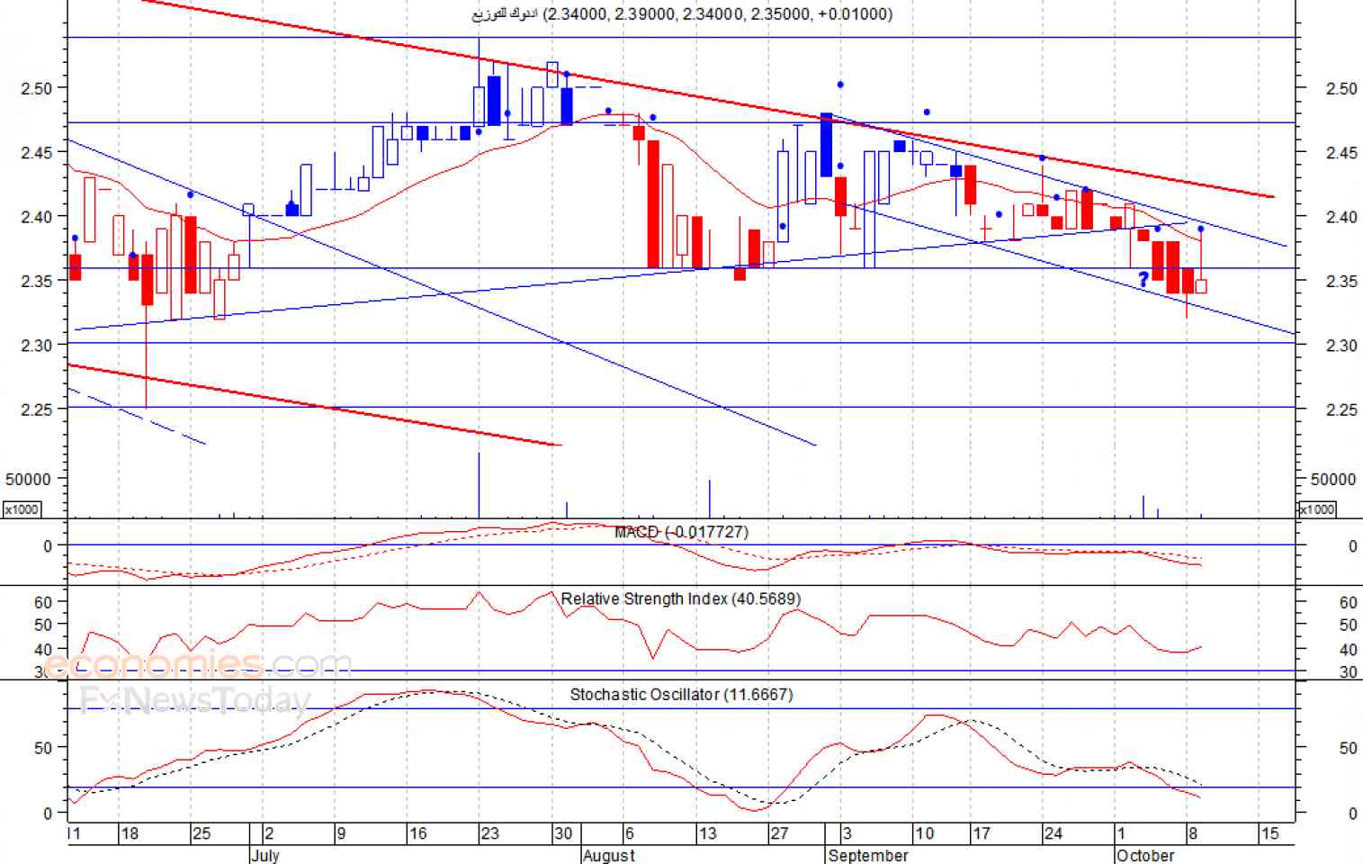ومن المتوقع ان يكون النطاق السعري خلال جلسة اليوم بين مستوى الدعم وهو 2.32 وبين مستوى المقاومة هو 2.37 درهم