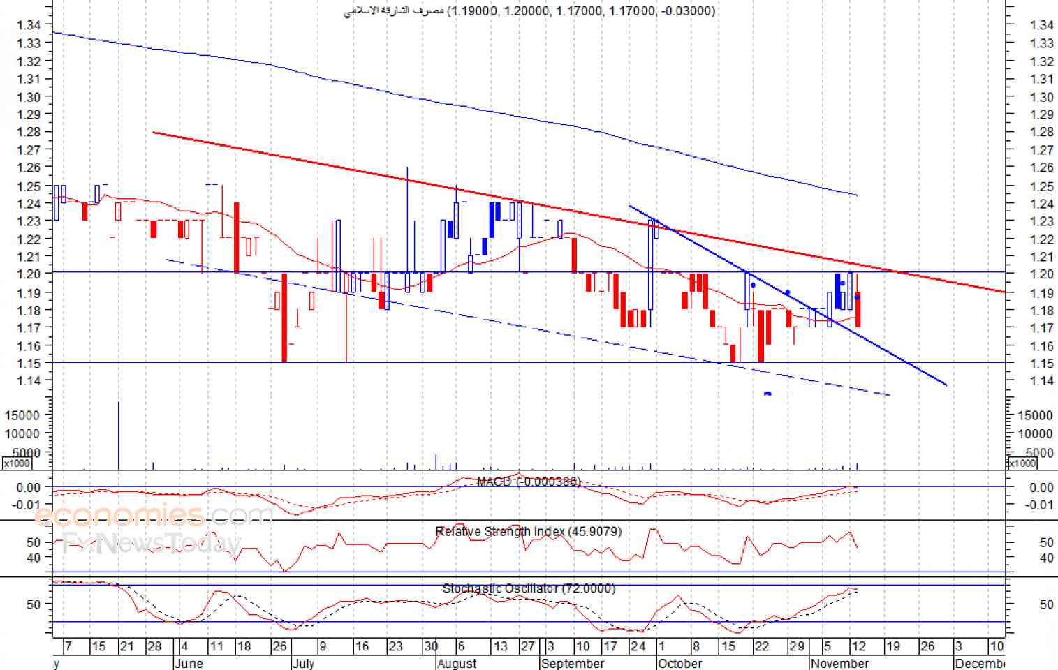سيطرت القوى البيعية على تداولات السهم خلال جلسة أمس الثلاثاء، حيث انخفض بقوة ليغلق عند ادنى مستوى له خلال الجلسة وهو 1.17 درهم، وذلك بعدما سجل ارتفاع بلغ 1.20 درهم، والذي يعد مستوى المقاومة الحالي، مخترقا بذلك متوسطه المتحرك لـ 20 يوم، لذلك نتوقع ان يعمق السهم من خسائره في الاجل القصير لمستوى الدعم 1.15 درهم كمستوى اول، شرط ثبات السهم أسفل مستوى 1.20 درهم.