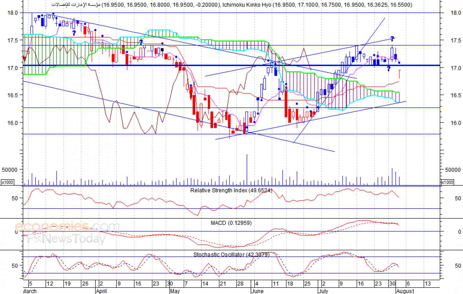 انخفض السهم بفجوة سعرية خلال اخر جلسات الأسبوع الماضي، حيث اغلق الخميس عند مستوى 16.95 درهم، مخترقا بذلك مستوى الدعم السابق والهام عند 17.05 درهم، وهو المستوى الذي أشرنا اليه في تقاريرنا السابقة، مكون بذلك السهم نموذج القمة الثنائي والذي ولد هدفا سعريا عند مستوى 16.70 درهم، وهو المستوى الذي يتجه اليه السهم حاليا كمستوى اول ثم 16.25 درهم كمستوى ثان، شرط ثبات السهم أسفل مستوى 17.15 درهم. ومتوقع ان يكون النطاق السعري خلال جلسة اليوم بين مستوى الدعم هو 16.75 درهم وبين مستوى المقاومة هو 17.00 درهم