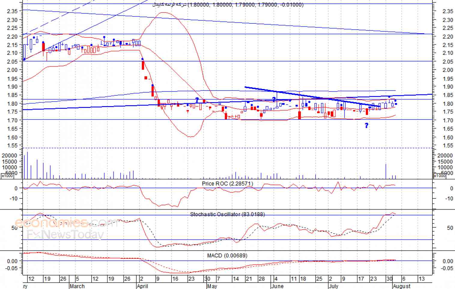 انخفض السهم بشكل طفيف نهاية اخر تداولات الأسبوع الماضي، حيث اغلق عند مستوى 1.79 درهم، وذلك بعدما لامس مستوى المقاومة الحالي عند 1.83 درهم، كما تعكس المؤشرات الفنية مثل مؤشر استوكاستيك حالة شراء المبالغ فيه، وهو ما نتوقع ان يساهم في دفع السهم لأسفل لمستوى الدعم 1.70 درهم كمستوى اول، الا ان هذا التوقع بفرض ثبات السهم أسفل مستوى 1.84 درهم. ومتوقع ان يكون النطاق السعري خلال جلسة اليوم بين مستوى الدعم هو 1.78 درهم وبين مستوى المقاومة هو 1.80 درهم