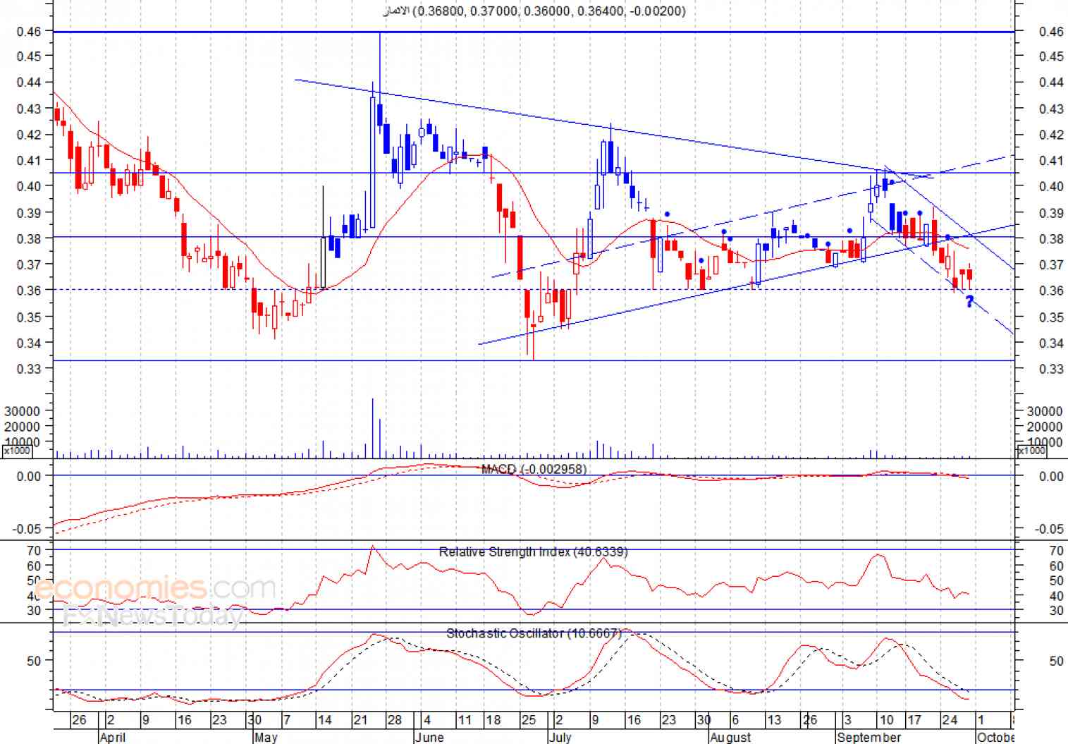 ومتوقع ان يكون النطاق السعري خلال جلسة اليوم بين مستوى الدعم هو 0.35 درهم وبين مستوى المقاومة هو 0.37 درهم