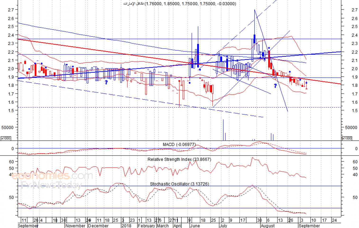 ومن المتوقع ان يكون النطاق السعري خلال جلسة اليوم بين مستوى الدعم هو 1.68 درهم وبين مستوى المقاومة هو 1.82 درهم