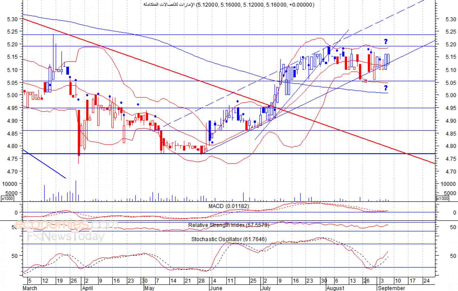 ومن المتوقع ان يكون النطاق السعري خلال جلسة اليوم بين مستوى الدعم وهو 5.13 وبين مستوى المقاومة هو 5.19 درهم