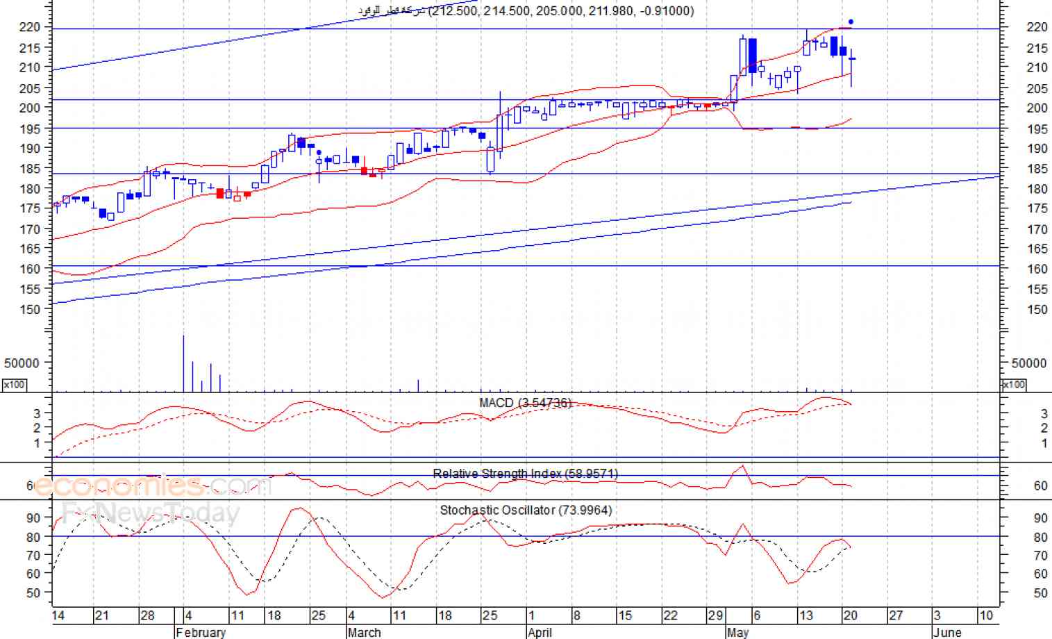 انخفض السهم لثالث جلسة على التوالي، حيث اغلق امس الثلاثاء، حيث اغلق عند مستوى 211.98 ريال، وذلك بعدما تلقى مقاومة قوية عند مستوى 220 ريال، وفي ظل ظهور انحراف سلبي على مؤشر القوة النسبية، لذلك نتوقع عمليات جني أرباح قد تهبط به لمستوى الدعم 203 ريال كمستوى اول ثم 195 ريال كمستوى ثان، شرط عدم تجاوز السهم لمستوى 220 ريال.