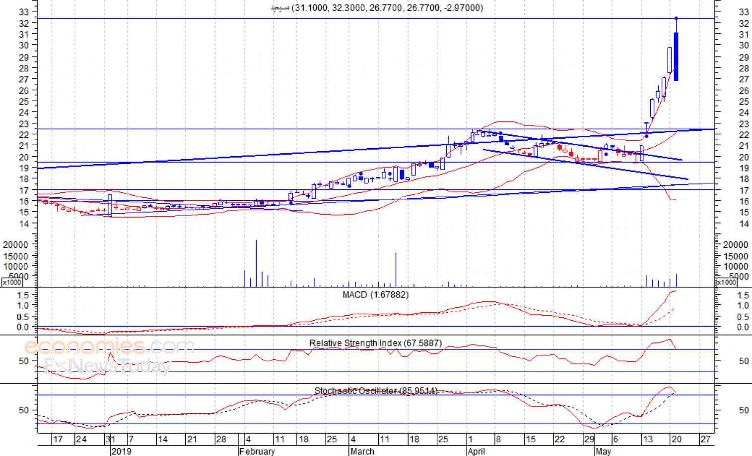 ومن المتوقع ان يكون النطاق السعري خلال جلسة اليوم بين مستوى الدعم هو 25.5 ريال وبين مستوى المقاومة هو 28 ريال