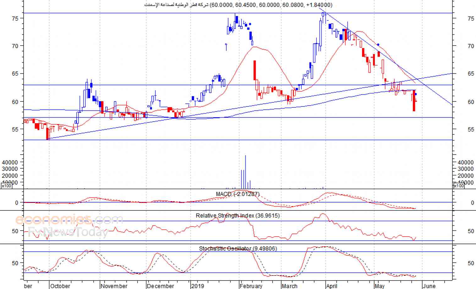 انهى السهم تداولات امس الأربعاء عند مستوى 60.08 ريال، مخترقا مستوى الدعم السابق عند 63 ريال، وهو ما يعد إشارة سلبية، كما انزلق السهم اسفل متوسطه المتحرك لـ 200 يوم، مما يفتح الباب امام السهم لإمكانية الانخفاض لمستوى الدعم 57 ريال كمستوى اول ثم 53 ريال كمستوى ثان، شرط بقاء السهم اسفل مستوى 63 ريال.