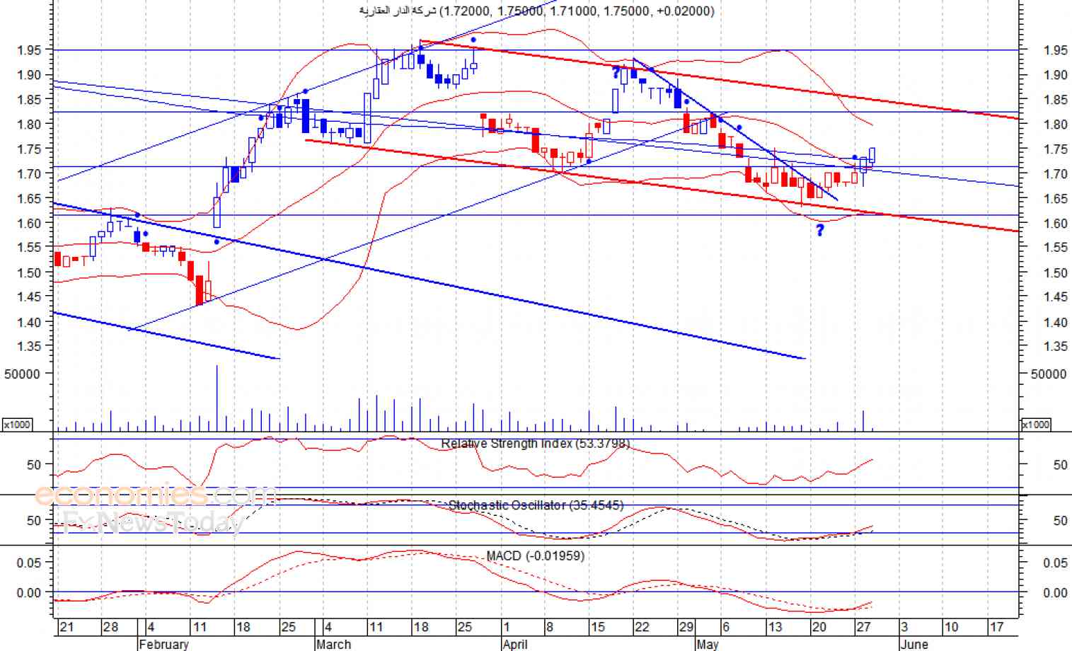 ومن المتوقع ان يكون النطاق السعري خلال جلسة اليوم بين مستوى الدعم وهو 1.72 وبين مستوى المقاومة هو 1.78 درهم