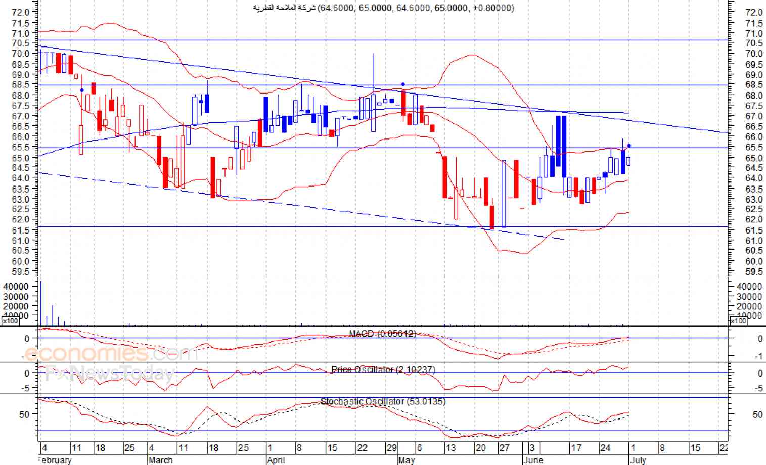 قلص السهم من خسائره التي حققها خلال جلسة الخميس الماضي، حيث اغلق امس الاحد مرتفعا عند مستوى 65 ريال، مقتربا بذلك مستوى مقاومته الحالي والقوي عند 65.50 ريال، حيث يقابل الحد العلوي لمؤشر "Bollinger Bands" لذلك نتوقع ان يشهد السهم عمليات جني أرباح قد تهبط به لمستوى الدعم 63 ريال مرة أخرى، شرط بقاء السهم اسفل مستوى 66 ريال.