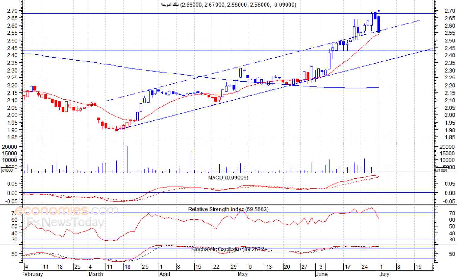 ومن المتوقع ان يكون النطاق السعري خلال جلسة اليوم بين مستوى الدعم هو 2.47 ريال وبين مستوى المقاومة هو 2.63 ريال