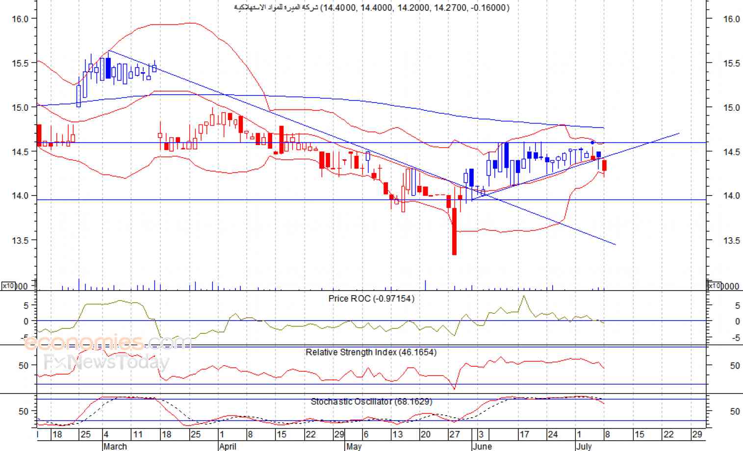ومن المتوقع ان يكون النطاق السعري خلال جلسة اليوم بين مستوى الدعم هو 14.09 ريال وبين مستوى المقاومة هو 14.38 ريال