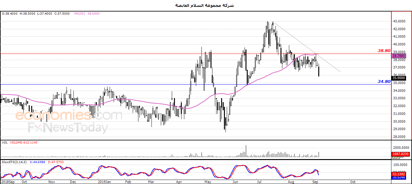 لذلك نحن نتوقع المزيد من الانخفاض للسهم خلال تداولاته القادمة ، طيلة ثبات مستوى المقاومة 38.80 ، ليستهدف مستوى الدعم 34.80 .