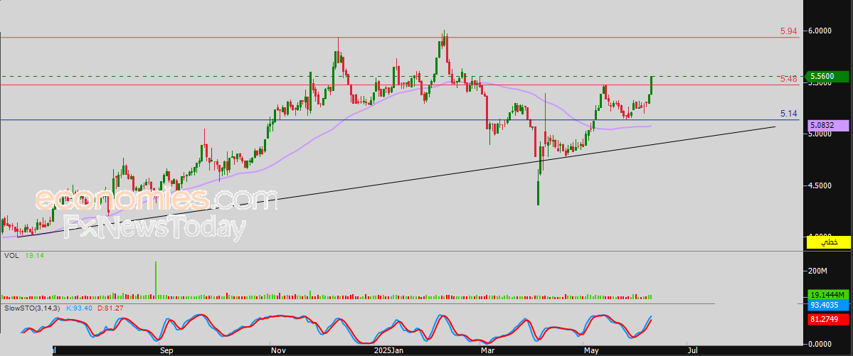 وبناءاً على ذلك فتوقعاتنا تشير إلى المزيد من الصعود لسعر السهم خلال تداولاته القادمة، خاصة طيلة استقراره أعلى سعر 5.48 درهم، ليستهدف مستوى المقاومة المحوري 5.94 درهم.