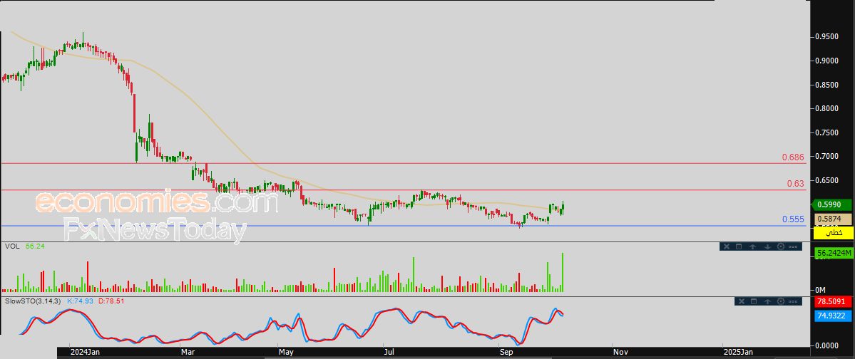 لهذا فتوقعاتنا تشير إلى المزيد من الصعود لسعر السهم خلال تداولاته القادمة، ليستهدف مستوى المقاومة المحوري والقريب 0.63 استعداداً لمهاجمته.