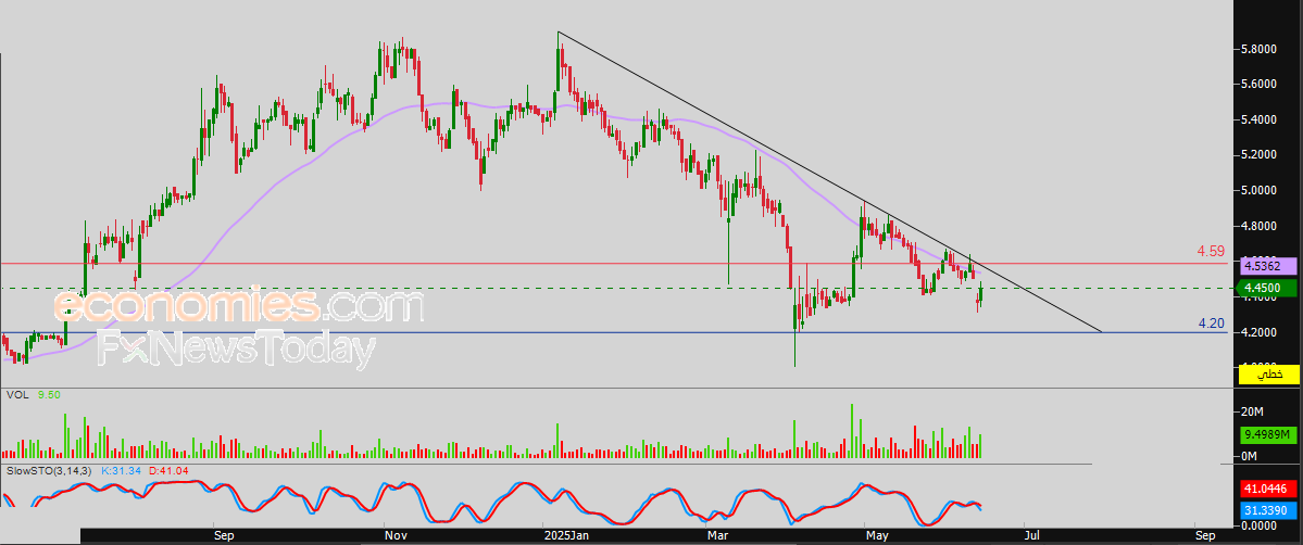 لهذا تشير توقعاتنا إلى عودة هبوط سعر السهم خلال تداولاته القادمة، طيلة ثبات المقاومة 4.59 درهم، ليستهدف مستوى الدعم المحوري 4.20 درهم.