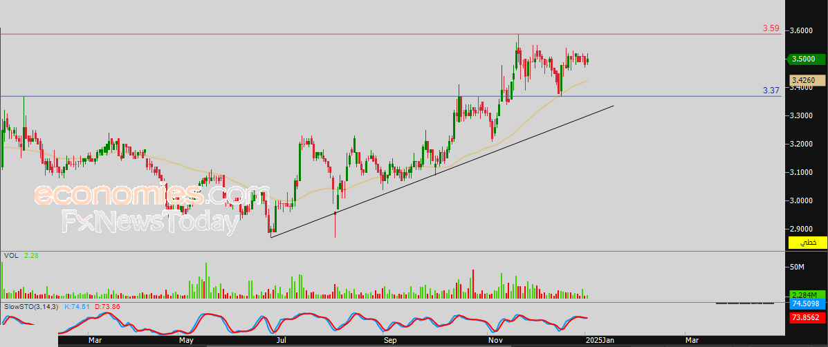 لهذا فتوقعاتنا تشير إلى المزيد من الصعود لسعر السهم خلال تداولاته القادمة، ليستهدف مستوى المقاومة المحوري والسابق ذكره 3.59 درهم استعداداً لمهاجمته.