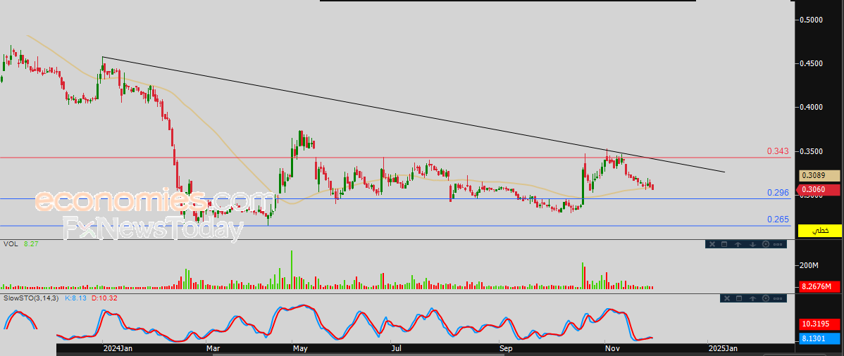 لذلك نحن نتوقع المزيد من الهبوط لسعر السهم خلال تداولاته القادمة، ليستهدف مستوى الدعم المهم والقريب 0.296 استعداداً لكسره.