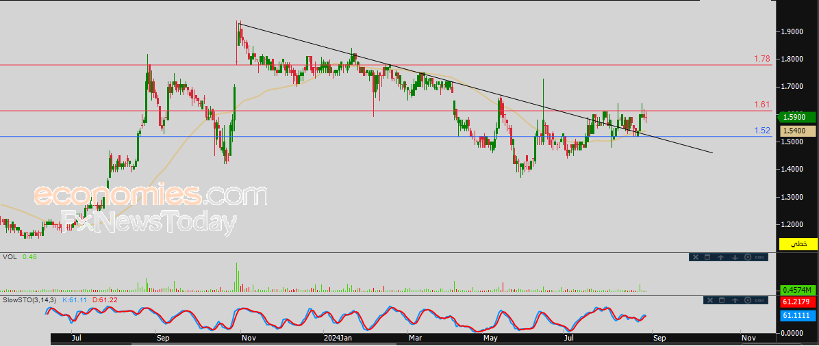 لذلك تشير توقعاتنا إلى ارتفاع سعر السهم خلال تداولاته القادمة، خاصة في حالة اختراقه لمستوى المقاومة 1.60، ليستهدف بعدها مستوى المقاومة 1.80.