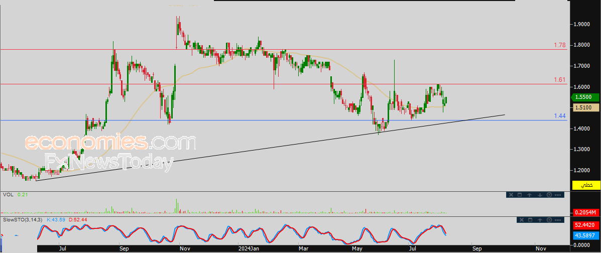 لهذا نحن نتوقع ارتفاع سعر السهم خلال تداولاته القادمة، طيلة ثبات مستوى الدعم 1.44، ليستهدف مستوى المقاومة المهم والقريب 1.60 استعداداً لمهاجمته.