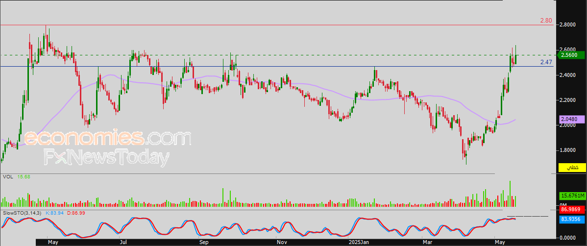 لذلك فتوقعاتنا تشير إلى ارتفاع سعر السهم خلال تداولاته القادمة، طيلة استقراره أعلى سعر 2.70 درهم، ليستهدف مستوى المقاومة المحوري 2.88 درهم.