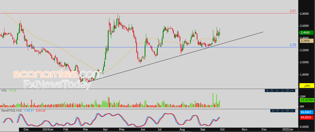 لذلك فتوقعاتنا تشير إلى المزيد من الصعود لسعر السهم خلال تداولاته القادمة، طيلة ثبات مستوى الدعم 2.25، ليستهدف مستوى المقاومة المحوري 2.80.