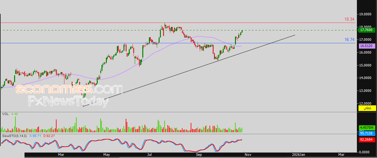 لهذا تشير توقعاتنا إلى صعود سعر السهم خلال تداولاته القادمة، طيلة ثبات مستوى الدعم 16.75 درهم، ليستهدف مستوى المقاومة المحوري 18.34 درهم استعداداً لمهاجمته.