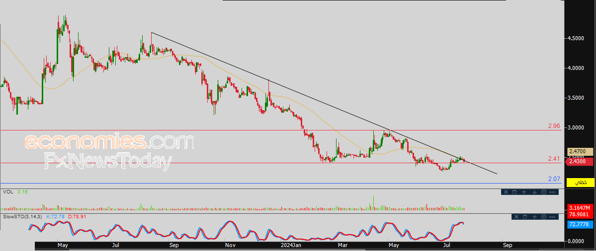 لذلك نحن نتوقع المزيد من الهبوط لسعر السهم خلال تداولاته القادمة، خاصة في حالة عودة استقراره دون مستوى 2.40، ليستهدف مستوى الدعم 2.00.