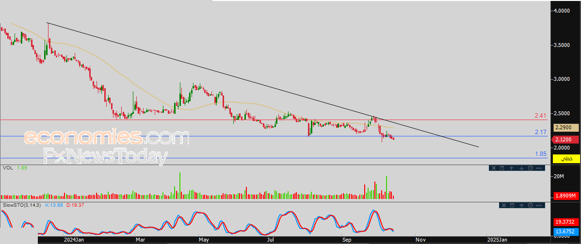 لذلك نحن نتوقع المزيد من الهبوط لسعر السهم خلال تداولاته القادمة، خاصة طوال استقراره دون مستوى 2.17، ليستهدف مستوى الدعم 1.85.