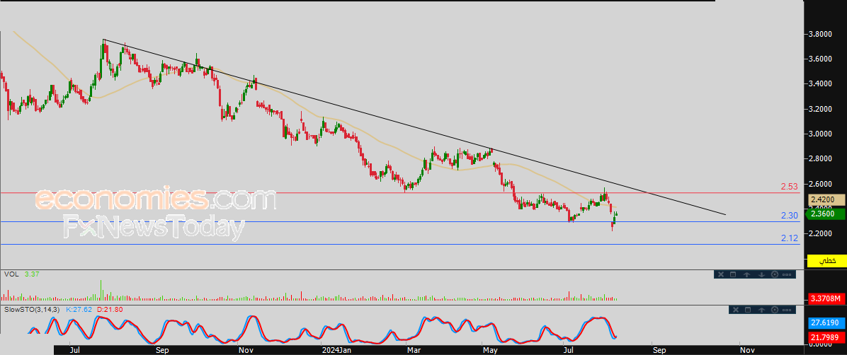 لذلك نحن نرجح عودة هبوط سعر السهم خلال تداولاته القادمة، خاصة في حالة كسره للدعم 2.30، ليستهدف بعدها مستوى الدعم 2.10.