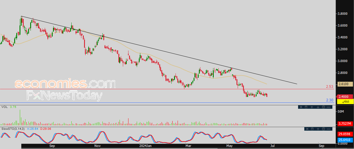 لذلك نحن نتوقع المزيد من الهبوط لسعر السهم خلال تداولاته القادمة، طيلة ثبات المقاومة 2.53، ليستهدف مستوى الدعم 2.30.