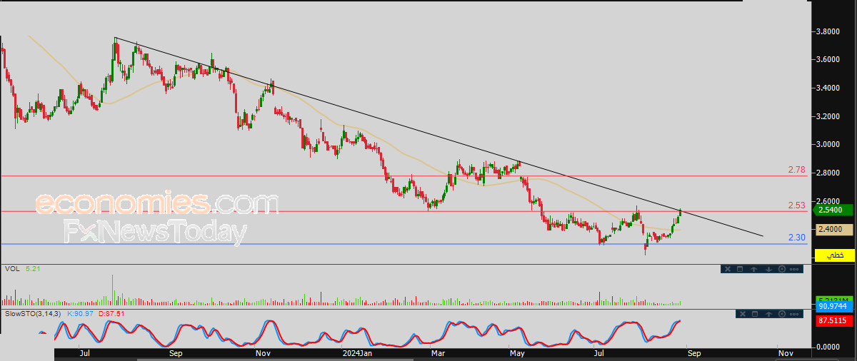 لهذا تقف توقعاتنا على الحياد انتظاراً لسلوك السهم حيال مستوى المقاومة المحوري 2.50، ففي حالة اختراق تلك المقاومة سيفتح المجال أمام السهم لتحقيق المزيد من المكاسب، ليستهدف بعدها مستوى المقاومة 2.80.