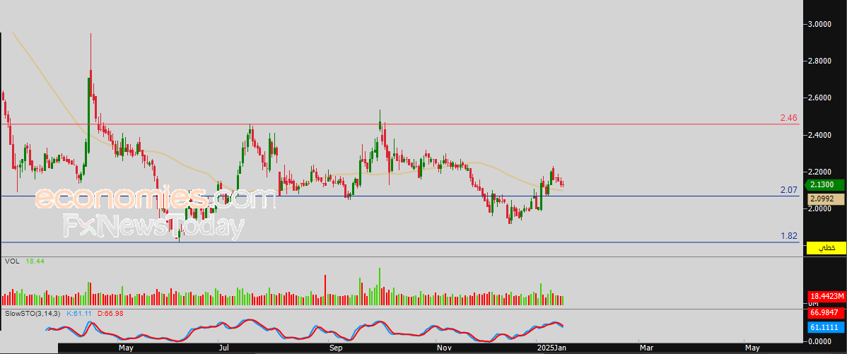 لهذا فتوقعاتنا ترجح عودة صعود سعر السهم خلال تداولاته القادمة، طيلة استقراره أعلى مستوى الدعم 2.07، ليستهدف مستوى المقاومة المحوري 2.46.