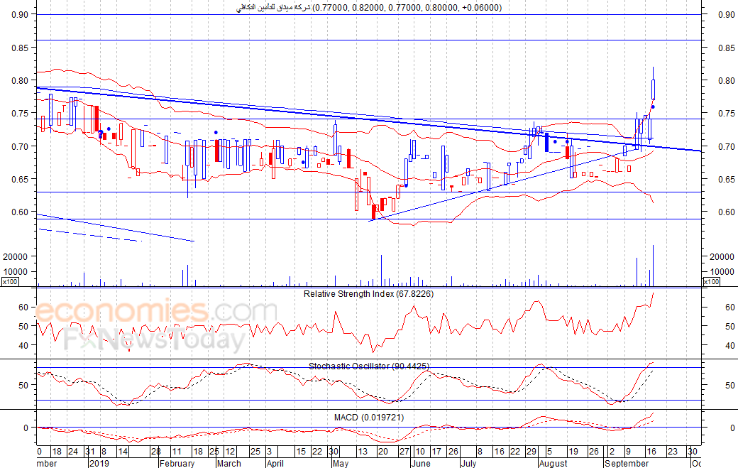 ومن المتوقع ان يكون النطاق السعري خلال جلسة اليوم بين مستوى الدعم وهو 0.77 وبين مستوى المقاومة هو 0.85 درهم