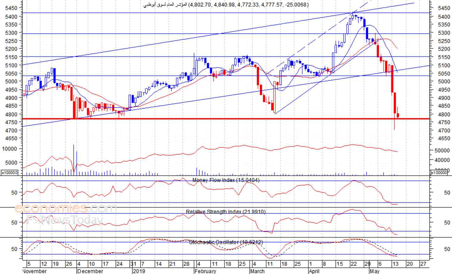 انهى المؤشر تداولات امس الأربعاء عند ادنى مستوى له خلال الجلسة، حيث اغلق عند مستوى 4777 نقطة، ملامسا لمستوى الدعم الحالي عند 4750 نقطة، وفي ظل تداول مؤشر استوكاستيك في منطقة البيع المبالغ فيه، لذلك نتوقع ان يرتد المؤشر لاعلى مرة أخرى لمستوى المقاومة 5030 نقطة، شرط بقاء المؤشر اعلى مستوى 4750 نقطة.
