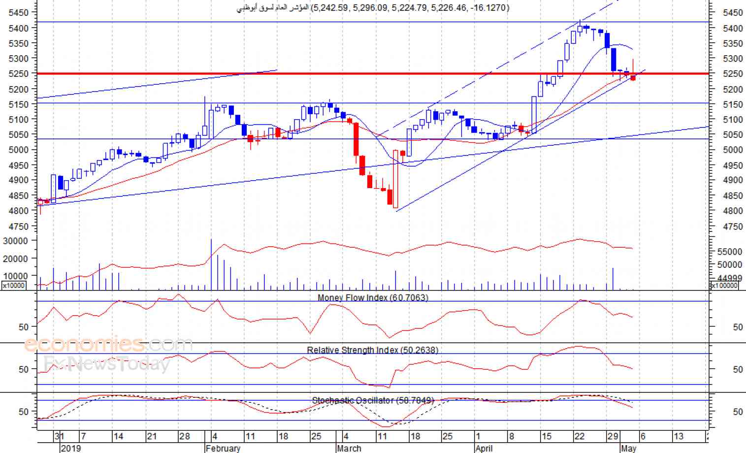 فشل المؤشر في الحفاظ على مكاسب اعلى مستوى 5250 نقطة، حيث انخفض خلال جلسة امس الاحد أولى جلسات الأسبوع الحالي ليغلق عند مستوى 5226 نقطة، مخترقا بذلك متوسطه المتحرك لـ 20 يوم، كما تراجع المؤشر مخترقا القناة الصاعدة قصيرة الأجل، مما يجعل الأنظار تتجه لاسفل لمستوى الدعم التالي عند 5150 ثم 5030 نقطة، شرط بقاء المؤشر اسفل مستوى 5300 نقطة.