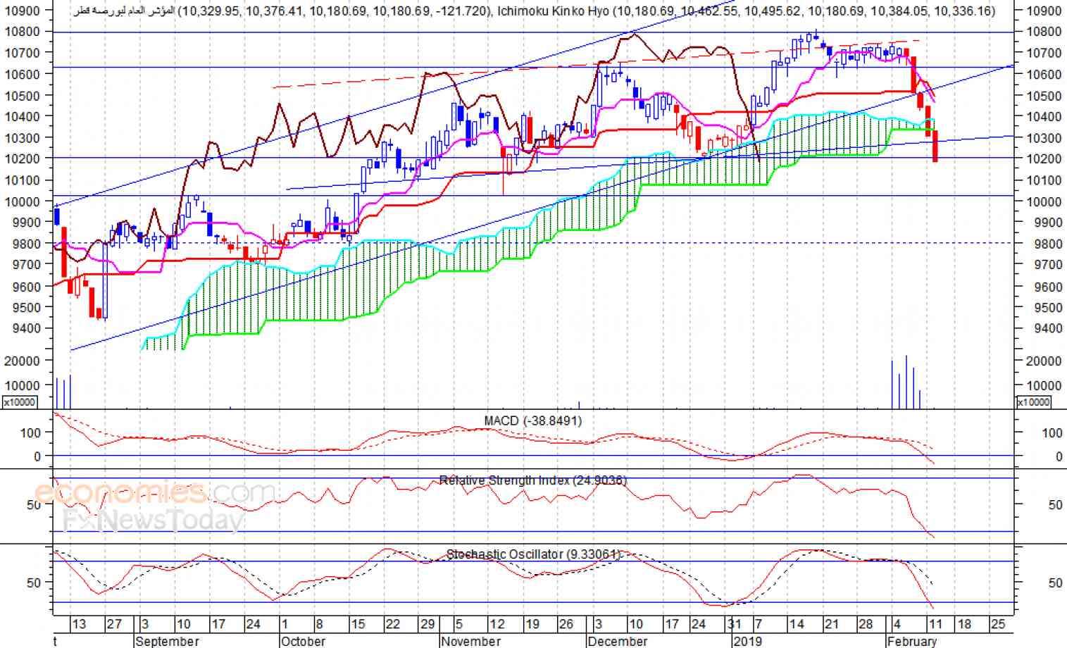 انخفض المؤشر كما توقعنا في تقاريرنا السابقة طيلة الأسبوع الحالي لهدفه السعري المتوقع عند مستوى 10200 نقطة، واخترقه حيث اغلق امس الأربعاء عند مستوى 10180 نقطة، كما اخترق المؤشر القناة الصاعدة متوسطة الأجل، وهو ما ولد هدفا سعريا عند مستوى 9800 نقطة، ويتجه المؤشر حاليا لمستوى الدعم التالي عند 10000 نقطة، شرط بقاء المؤشر اسفل مستوى 10350 نقطة.