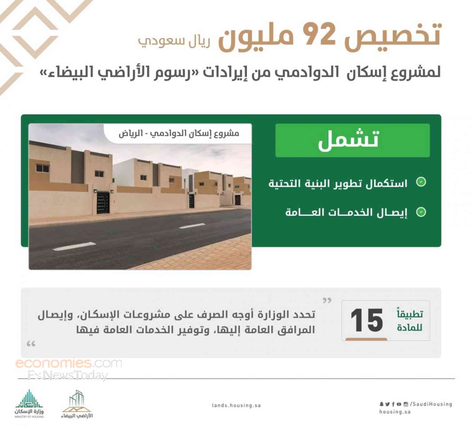 خصص برنامج رسوم الأراضي البيضاء التابع لوزارة الإسكان السعودية مبلغ 92 مليون ريال لاستكمال تنفيذ وإيصال خدمات البنية التحتية في مشروع "إسكان الدوادمي" بمنطقة الرياض.
