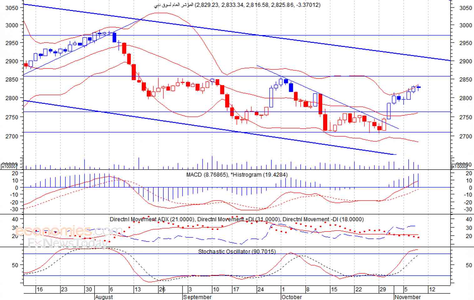 تراجع المؤشر اخر جلسات الاسبع الماضي ليغلق عند مستوى 2825 نقطة، في ظل تراجع قيم التداول، وهو ما يعد إشارة سلبية، ويعكس بدء عزوف المتداولين عن التداول، كما يقترب المؤشر من مستوى المقاومة الحالي والقوي عند 2860 نقطة، والذي نتوقع ان يساهم في دفع المؤشر لأسفل في عملية جني أرباح قد تهبط به لمستوى الدعم 2760 نقطة كمستوى اول ثم 2710 نقطة كمستوى ثان، شرط ثبات المؤشر أسفل مستوى 2870 نقطة.