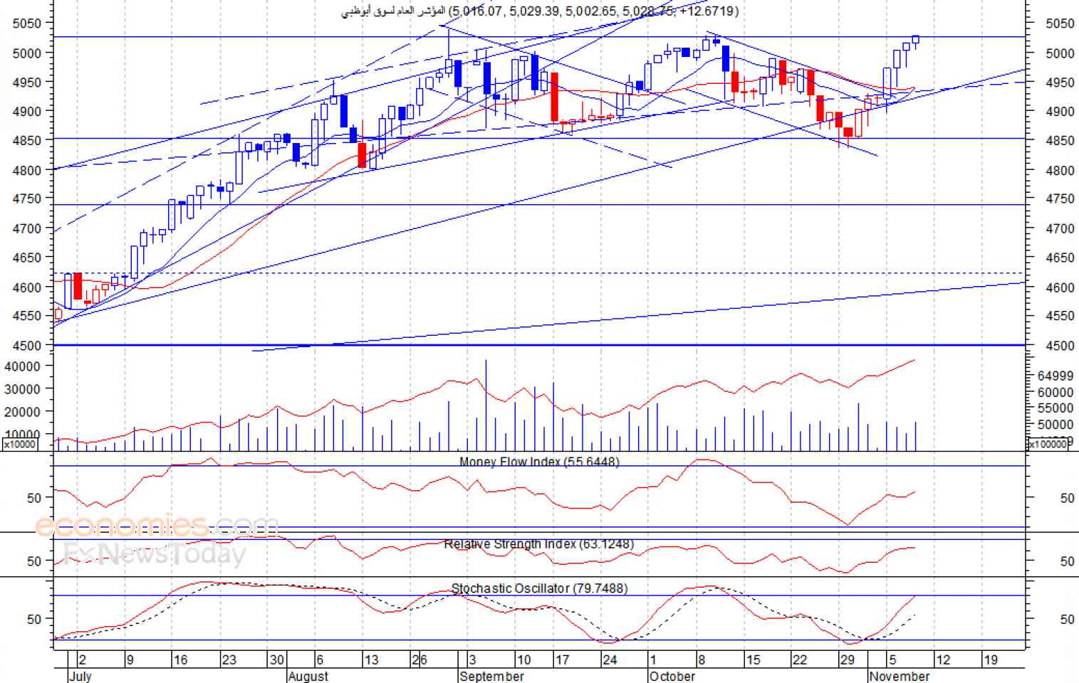 انهى المؤشر تداولات الأسبوع الماضي مرتفعا عند مستوى 5028 نقطة، وهو أعلى مستوى يصل اليه السهم خلال الأسبوع الماضي، ملامسا لمستوى المقاومة الحالي والقوي عند 5030 نقطة، كما تعكس المؤشرات الفنية مثل مؤشر القوة النسبية انحرافا سلبيا، لذلك نتوقع ان يشهد المؤشر عمليات جني أرباح قد تهبط به لمستوى الدعم 4850 نقطة كمستوى اول خلال الأيام والاسابيع القادمة، شرط بقاء المؤشر أسفل مستوى 5050 نقطة.