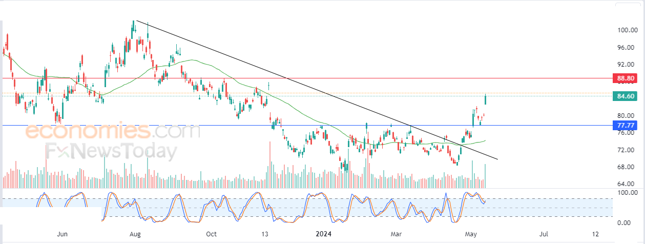 لهذا تشير توقعاتنا إلى المزيد من الصعود لسعر السهم خلال تداولاته القادمة، طيلة ثبات الدعم 77.77$، ليستهدف مستوى المقاومة 88.80$.