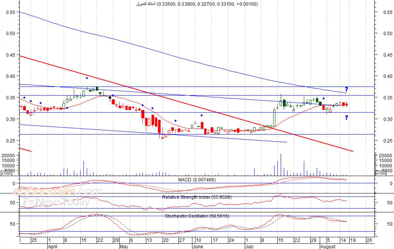 ومن المتوقع ان يكون النطاق السعري خلال جلسة اليوم بين مستوى الدعم هو 0.32 درهم وبين مستوى المقاومة هو 0.34 درهم