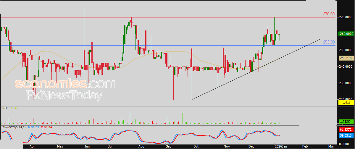 لذلك فتوقعاتنا تشير إلى صعود سعر السهم خلال تداولاته القادمة، طيلة ثبات مستوى الدعم 253.00 درهم، ليستهدف مستوى المقاومة المحوري 270.00 درهم.