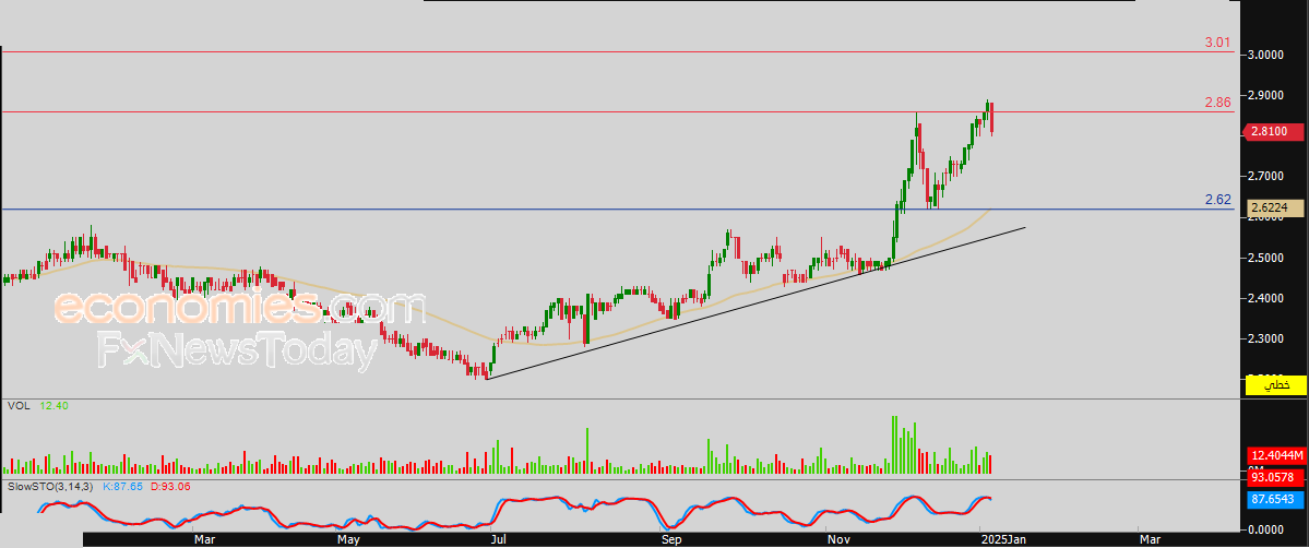 لذلك نحن نرجح عودة صعود سعر السهم خلال تداولاته القادمة، بشرط اختراقه أولاً للمقاومة سابقة الذكر 2.86، ليستهدف بعدها مستوى المقاومة الرئيسي 3.00 درهم.