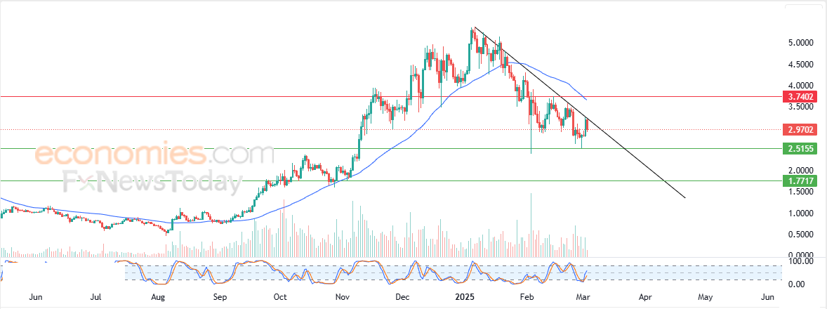 لذلك نحن نتوقع المزيد من الهبوط لسعر العملة خلال تداولاته القادمة، طيلة ثبات مستوى المقاومة 3.7402$. ليستهدف مستوى الدعم المهم 2.5155$ استعداداً لكسره.
