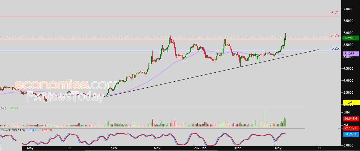 وعلى هذا الأساس فتوقعاتنا تشير إلى المزيد من الصعود لسعر السهم خلال تداولاته القادمة، خاصة في حالة تأكيد اختراقه للمقاومة سابقة الذكر 5.75 درهم، ليستهدف مستوى المقاومة 6.70 درهم.