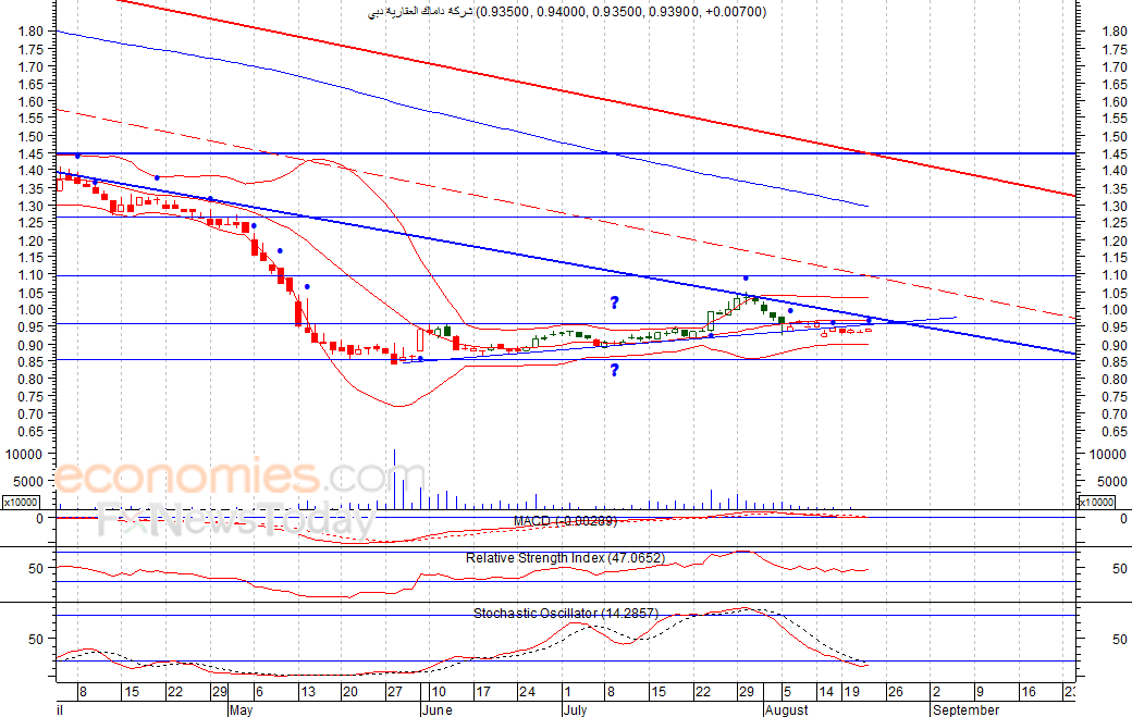 ارتفع السهم بشكل طفيف خلال جلسة الخميس الماضي، حيث اغلق عند مستوى 0.939 درهم، في ظل استمرار تحرك السهم في نطاق ضيق للغاية منذ بداية الشهر الحالي، ويقترب السهم حاليا من مستوى المقاومة 0.95 درهم، والذي نتوقع ان يساهم في دفع السهم لاسفل لمستوى الدعم الهام عند 0.85 درهم، شرط بقاء السهم اسفل مستوى 1 درهم.