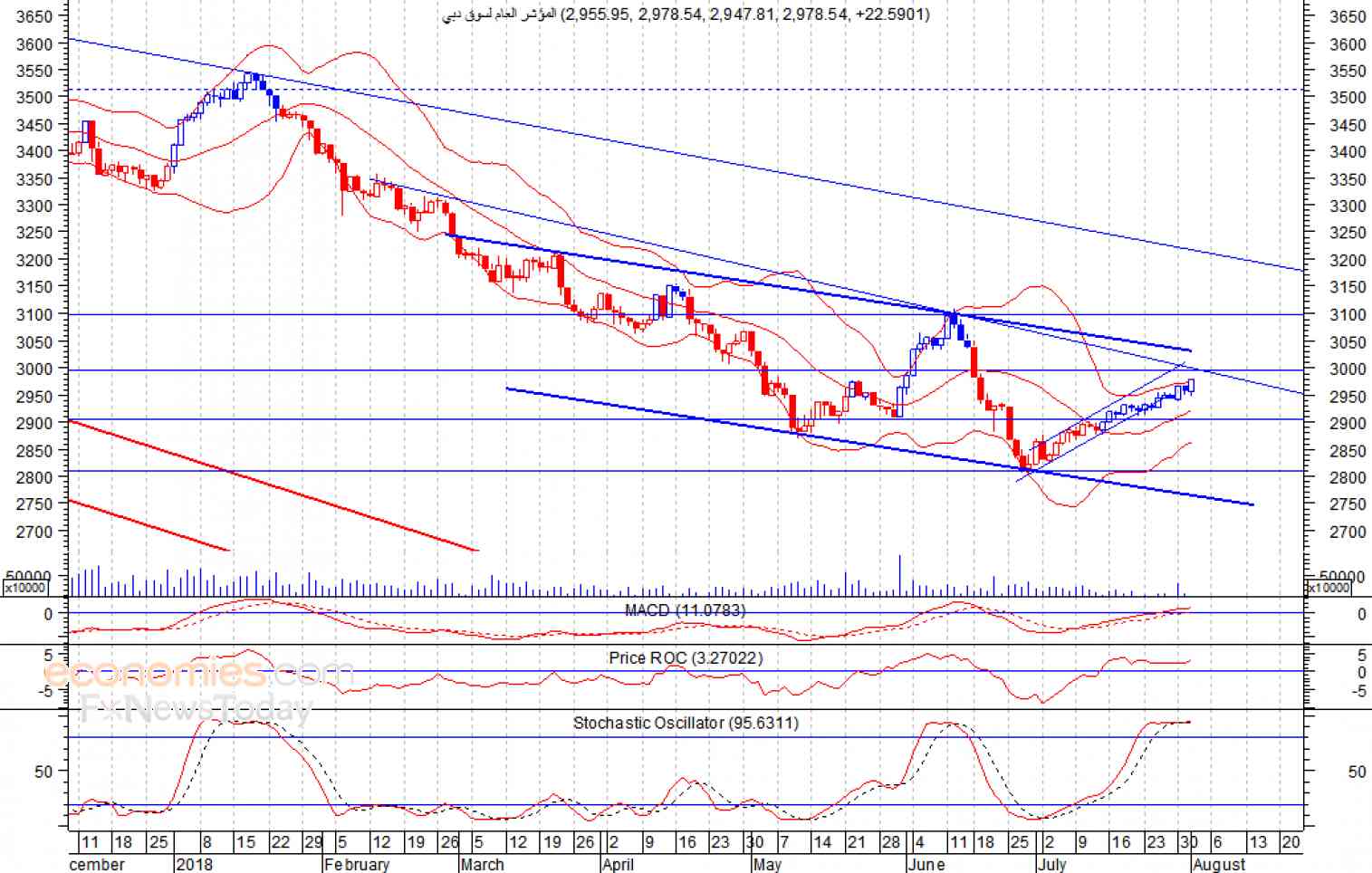 عوض المؤشر خسائره التي حققها خلال جلسة الثلاثاء الماضي، حيث اغلق عند مستوى 2978 نقطة أمس الأربعاء، مقتربا من خط اتجاهه الهابط متوسط الأجل، والذي يشكل مقاومة قوية قد تدفع بالمؤشر لأسفل لمستوى الدعم 2900 نقطة كمستوى اول ثم 2800 نقطة كمستوى ثان، خاصة في ظل تداول مؤشر استوكاستيك في منطقة الشراء المبالغ فيه، وذلك شرط ثبات المؤشر أسفل مستوى 3000 نقطة.