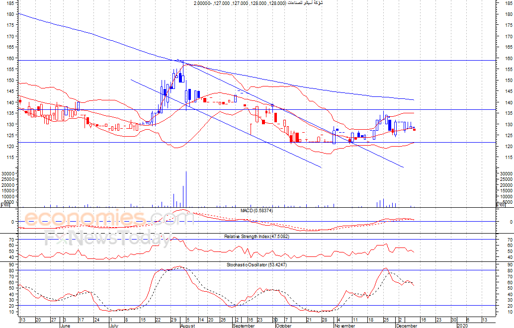 تراجع السهم في اخر جلسات الأسبوع الماضي، حيث أغلق عند مستوى 127 فلس، وذلك بعدما فشل في تجاوز مستوى مقاومته الحالي عند 136 فلس، لينزلق بذلك اسفل متوسطه المتحرك لـ 20 يوم، وهو ما يفتح الباب امام السهم لمزيد من الانخفاض لمستوى الدعم 120 فلس كمستوى اول ثم 115 فلس كمستوى ثان، شرط بقاء السهم اسفل مستوى 136 فلس.