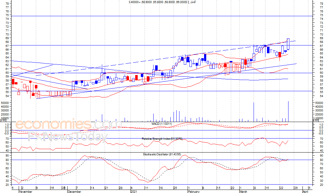 ومن المتوقع ان يكون النطاق السعري خلال جلسة اليوم بين مستوى الدعم وهو 68 وبين مستوى المقاومة هو 71.0 فلس